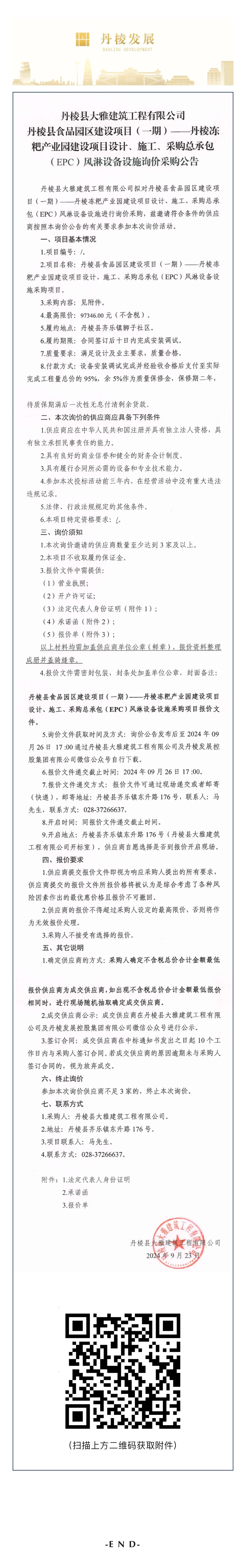 縣大雅建筑公司丹棱縣食品園區(qū)建設項目(一期)—丹棱凍粑產(chǎn)業(yè)園建設項目設計、施工、采購總承包(EPC)風淋設備設施詢價采購公告