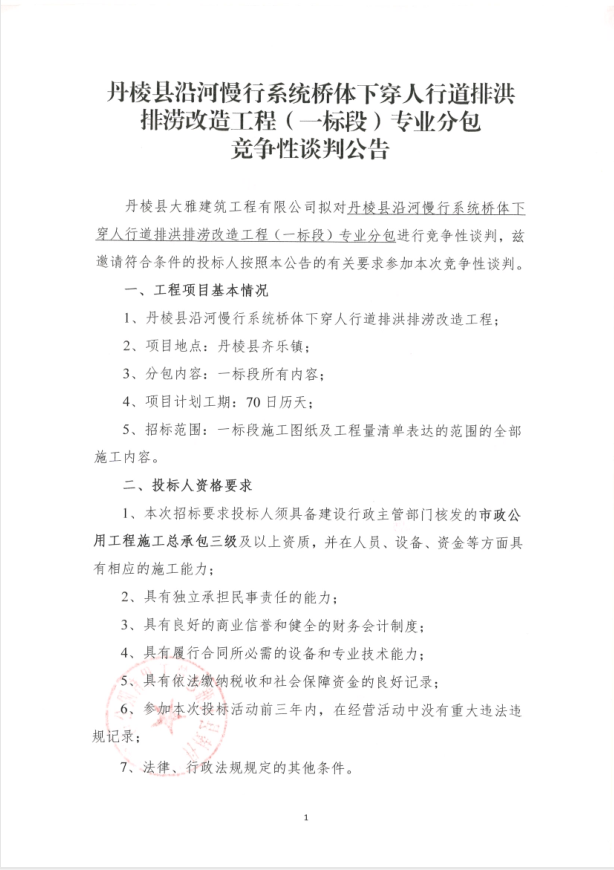 【大雅建筑公司】丹棱縣沿河慢行系統(tǒng)橋體下穿人行道排洪排澇改造工程(一標(biāo)段)專業(yè)分包競(jìng)爭(zhēng)性談判公告