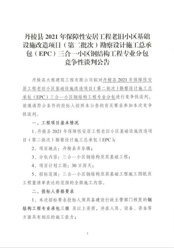 【大雅建筑公司】丹棱縣2021年保障性安居工程老舊小區(qū)基礎(chǔ)設(shè)施改造項(xiàng)目(第二批次)勘察設(shè)計(jì)施工總承包(EPC)三合一小區(qū)鋼結(jié)構(gòu)工程專業(yè)分包競爭性談判公告
