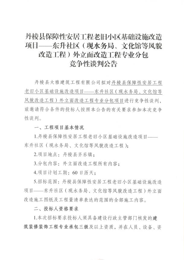 【大雅建筑公司】丹棱縣保障性安居工程老舊小區(qū)基礎(chǔ)設(shè)施改造項(xiàng)目--東升社區(qū)(現(xiàn)水務(wù)局、文化館等風(fēng)貌改造工程)外立面改造工程專(zhuān)業(yè)分包競(jìng)爭(zhēng)性談判公告