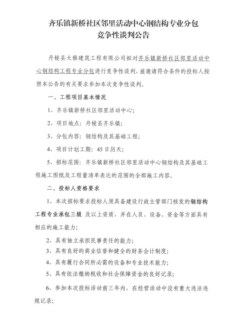 【大雅建筑公司】齊樂(lè)鎮(zhèn)新橋社區(qū)鄰里活動(dòng)中心鋼結(jié)構(gòu)專業(yè)分包競(jìng)爭(zhēng)性談判公告