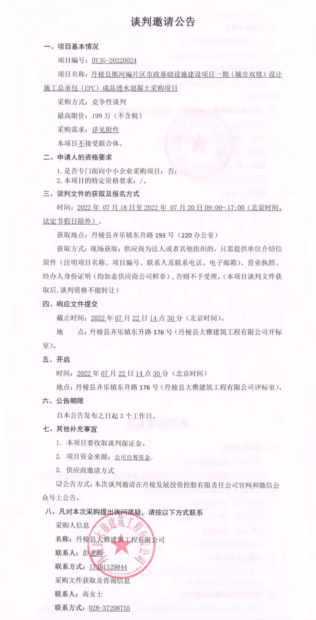 丹棱縣熊河碥片區(qū)市政基礎(chǔ)設(shè)施建設(shè)項(xiàng)目一期(城市雙修)設(shè)計(jì)施工總承包(EPC)成品透水混凝土采購項(xiàng)目談判邀請(qǐng)公告