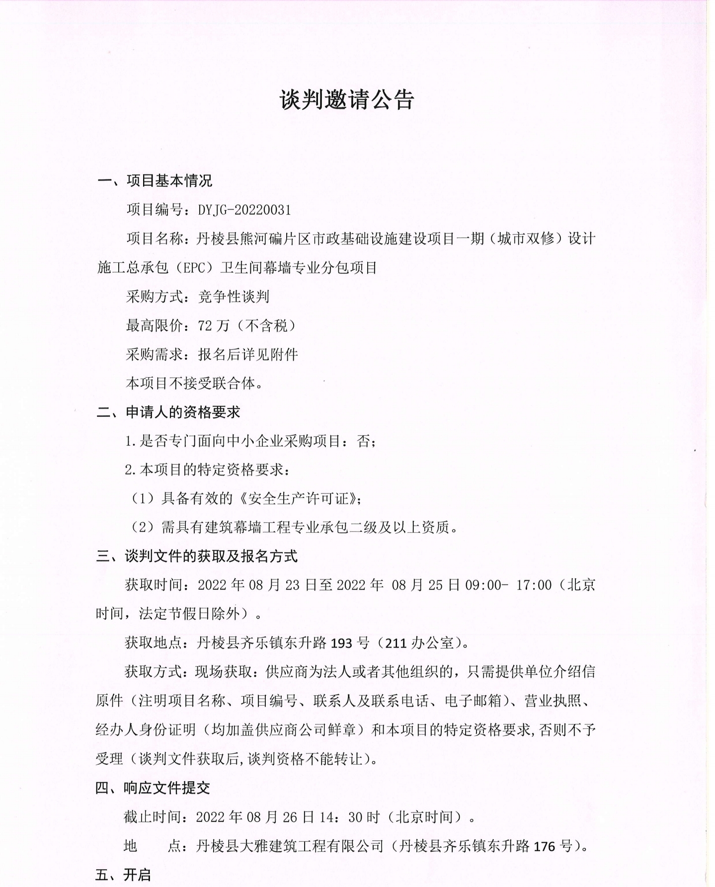 丹棱縣熊河碥片區(qū)市政基礎(chǔ)設(shè)施建設(shè)項目一期(城市雙修)設(shè)計施工總承包(EPC)衛(wèi)生間幕墻專業(yè)分包項目談判邀請公告