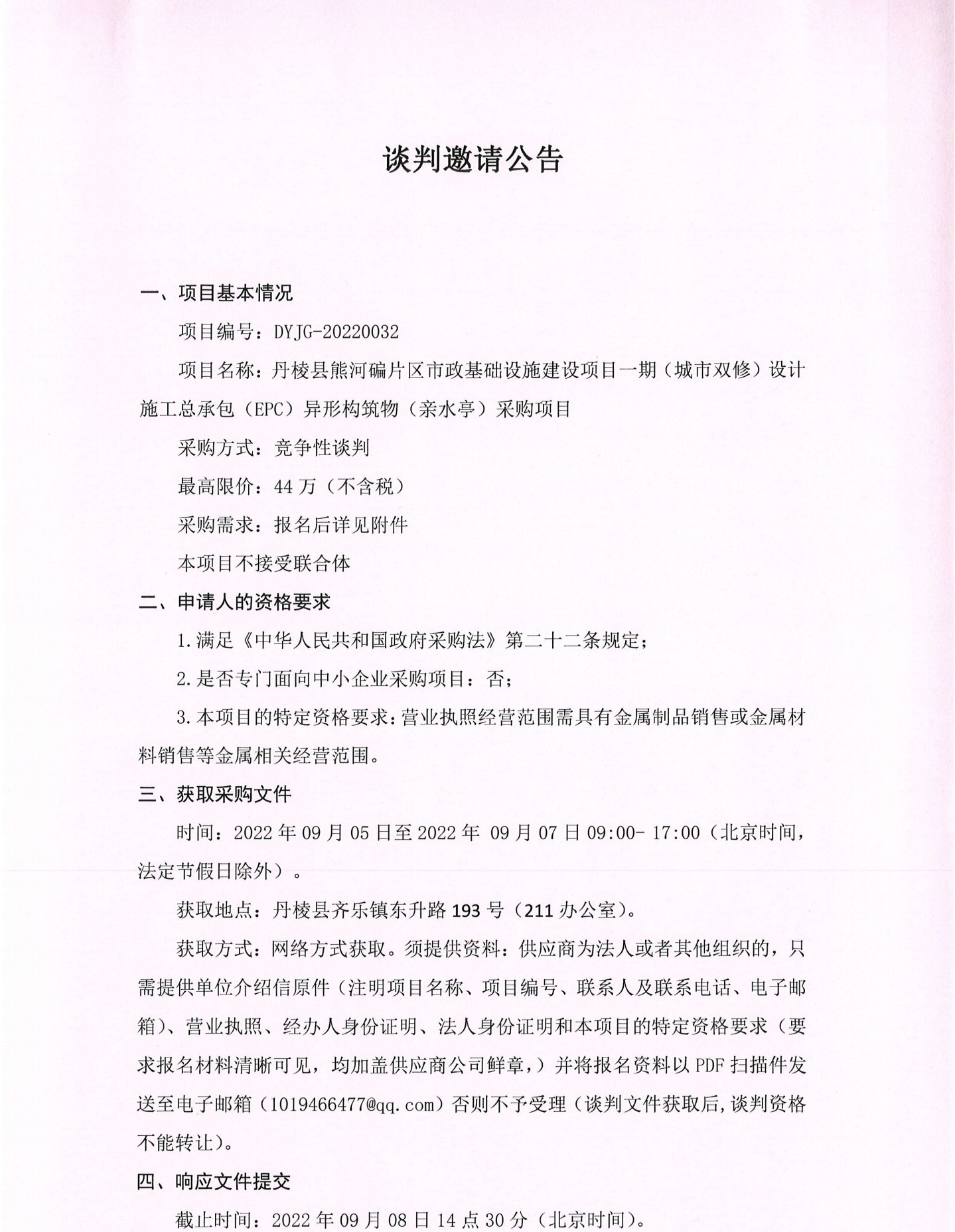 丹棱縣熊河碥片區(qū)市政基礎(chǔ)設(shè)施建設(shè)項(xiàng)目一期(城市雙修)設(shè)計(jì)施工總承包(EPC)異形構(gòu)筑物(親水亭)采購(gòu)項(xiàng)目談判邀請(qǐng)公告