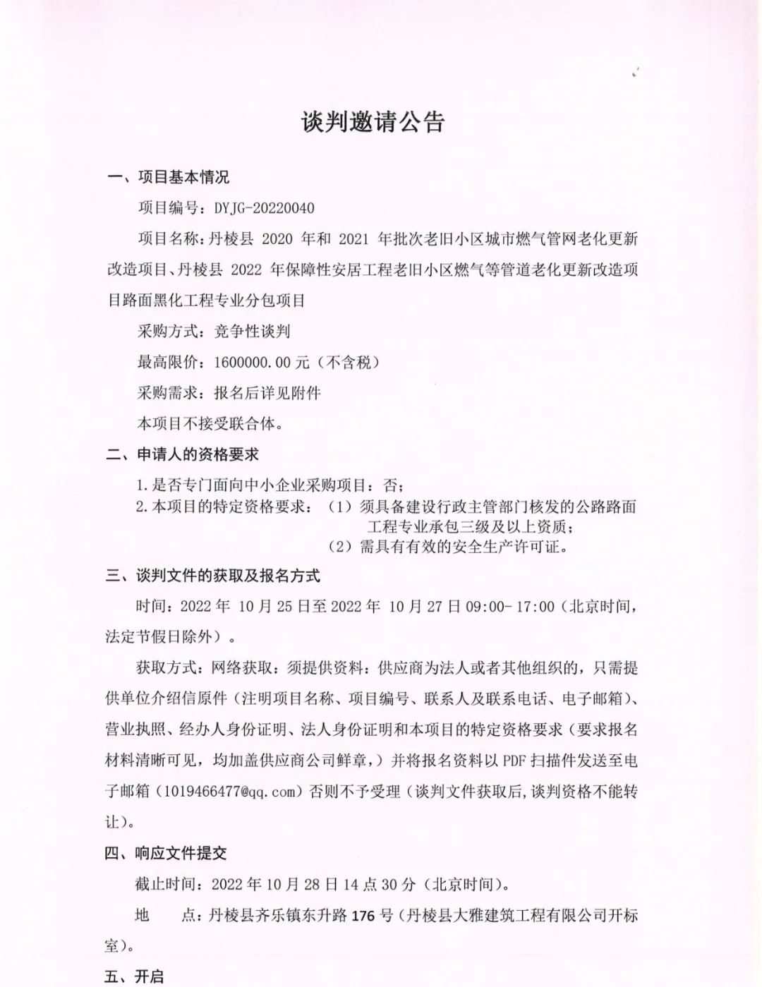 丹棱縣 2020 年、 2021 年、 2022 年保障性安居工程老舊小區(qū)燃氣等管道老化更新改造項目路面黑化工程專業(yè)分包項目談判邀請公告