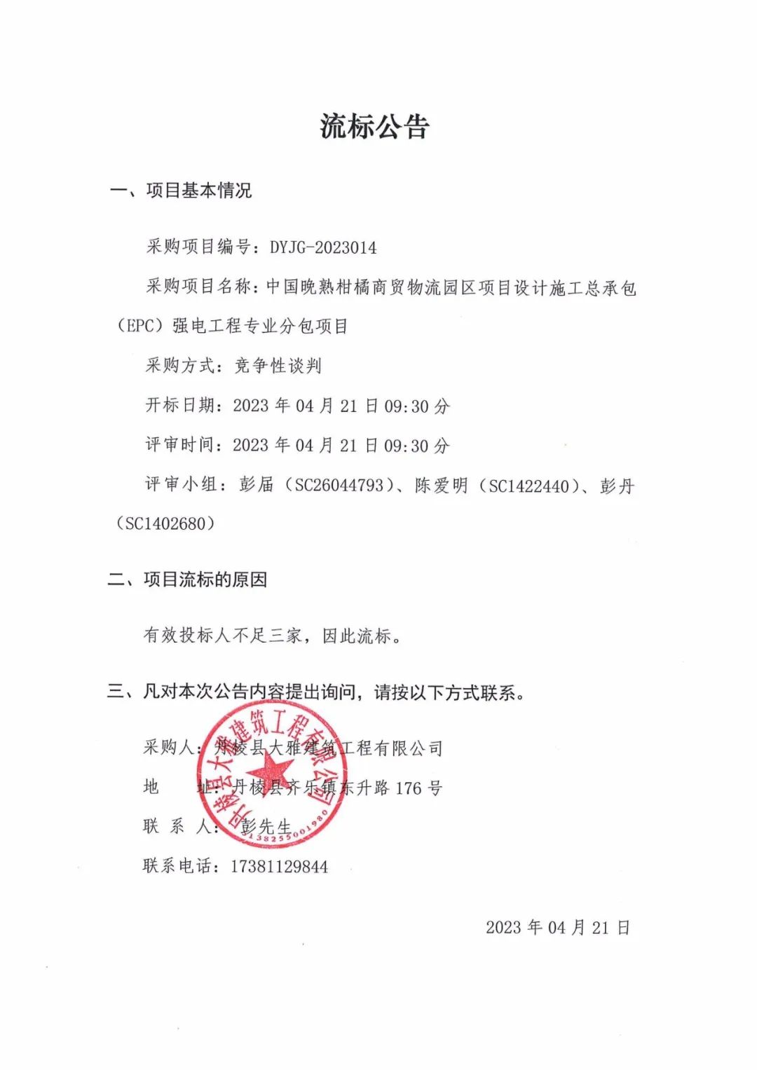 中國晚熟柑橘商貿物流園區(qū)項目設計施工總承包(EPC)強電工程專業(yè)分包項目流標公告