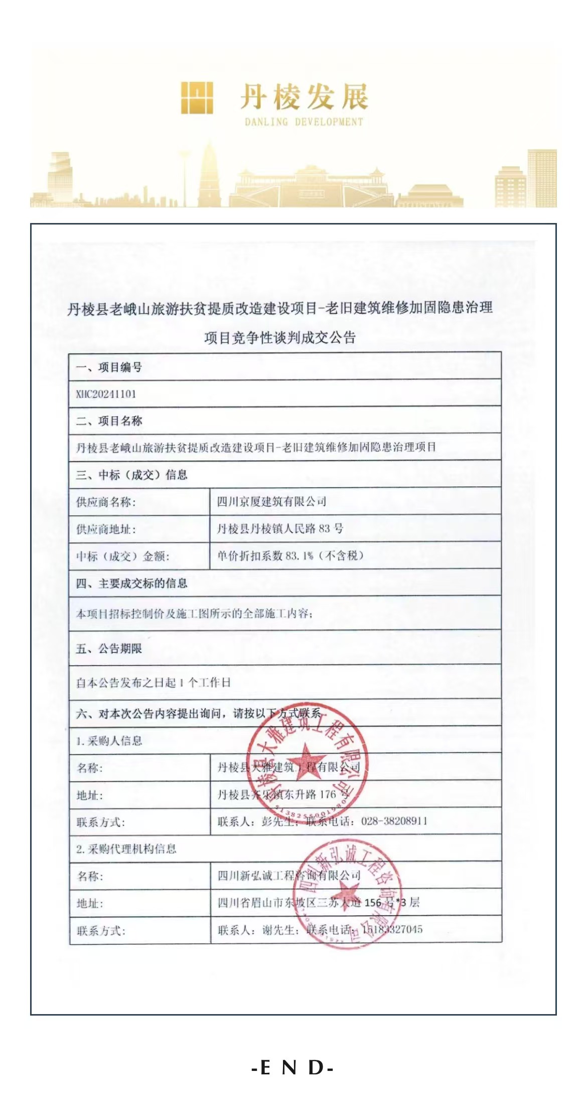 丹棱縣老峨山旅游扶貧提質(zhì)改造建設(shè)項目——老舊建筑維修加固隱患治理項目競爭性談判成交公告