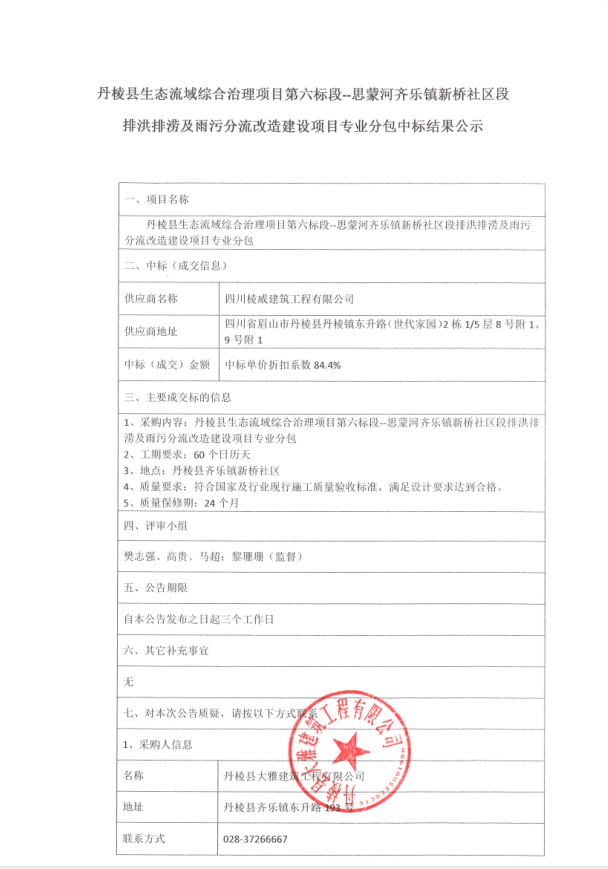 【大雅建筑公司】丹棱縣生態(tài)流域綜合治理項目第六標段—思蒙河齊樂鎮(zhèn)新橋社區(qū)段排洪排澇及雨污分流改造建設項目專業(yè)分包中標結果公示