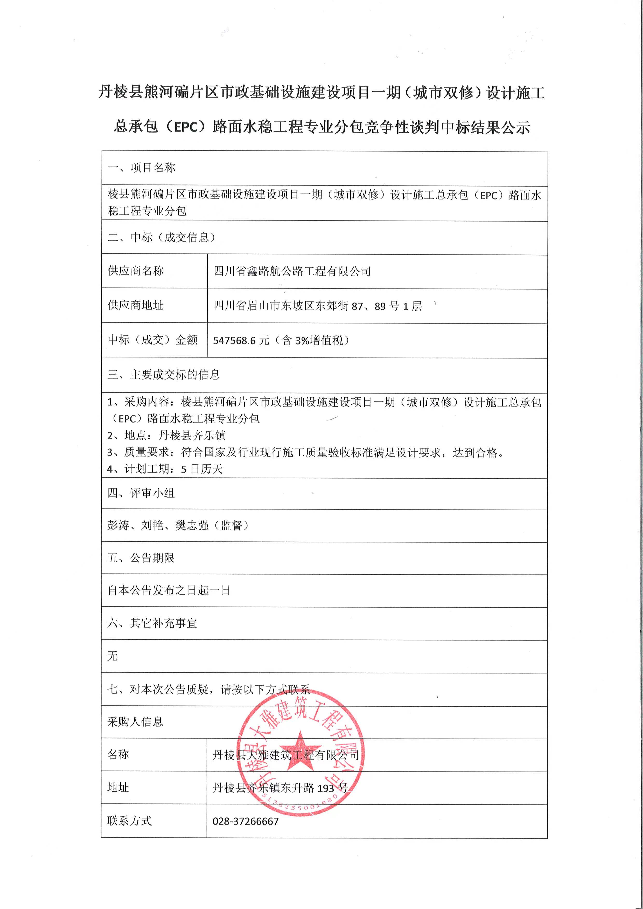 丹棱縣熊河碥片區(qū)市政基礎(chǔ)設(shè)施建設(shè)項目一期(城市雙修)設(shè)計施工總承包(EPC)路面水穩(wěn)工程專業(yè)分包競爭性談判中標結(jié)果公示