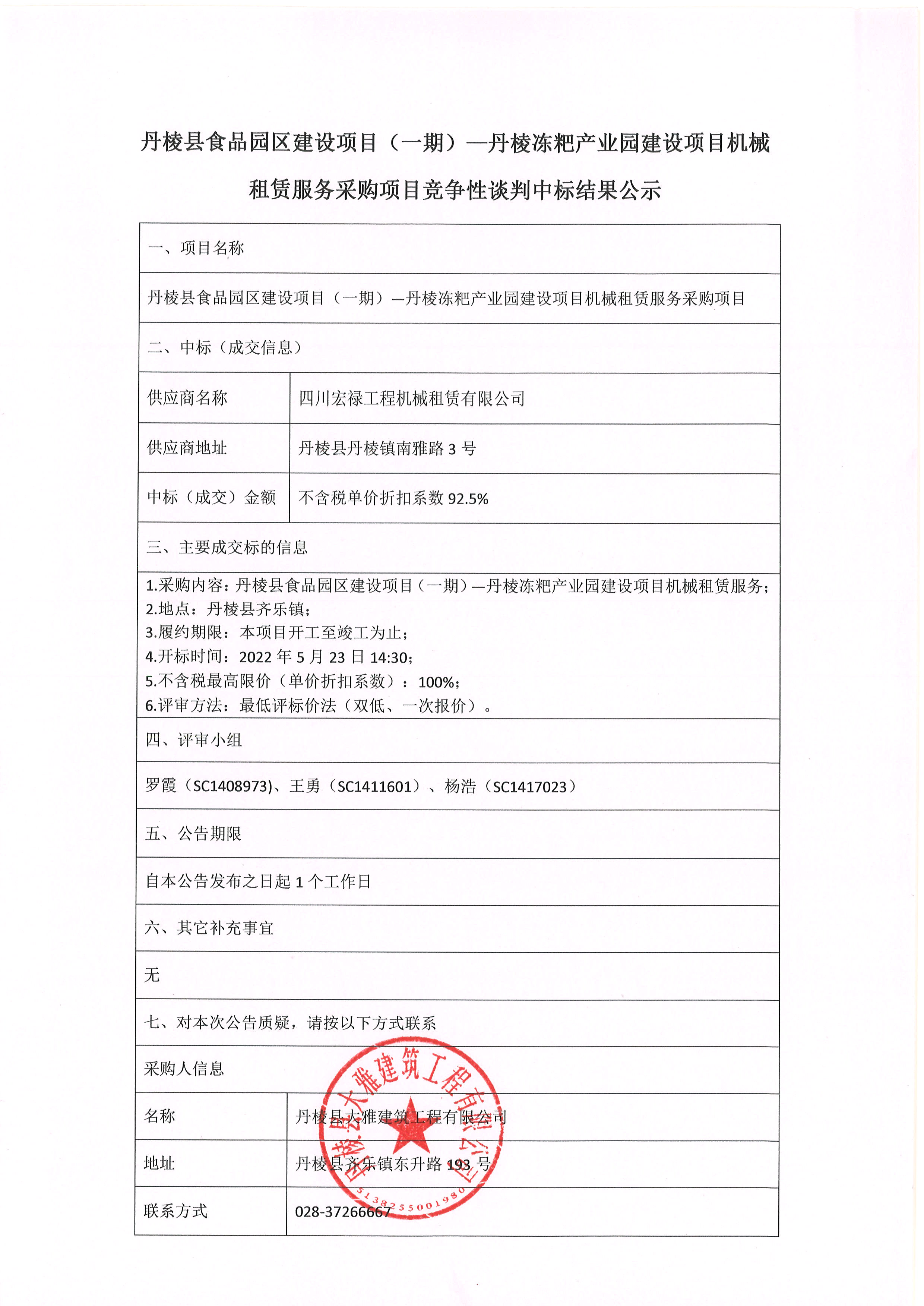丹棱縣食品園區(qū)建設項目(一期)-丹棱凍粑產(chǎn)業(yè)園建設項目機械 租賃服務采購項目競爭性談判中標結(jié)果公示