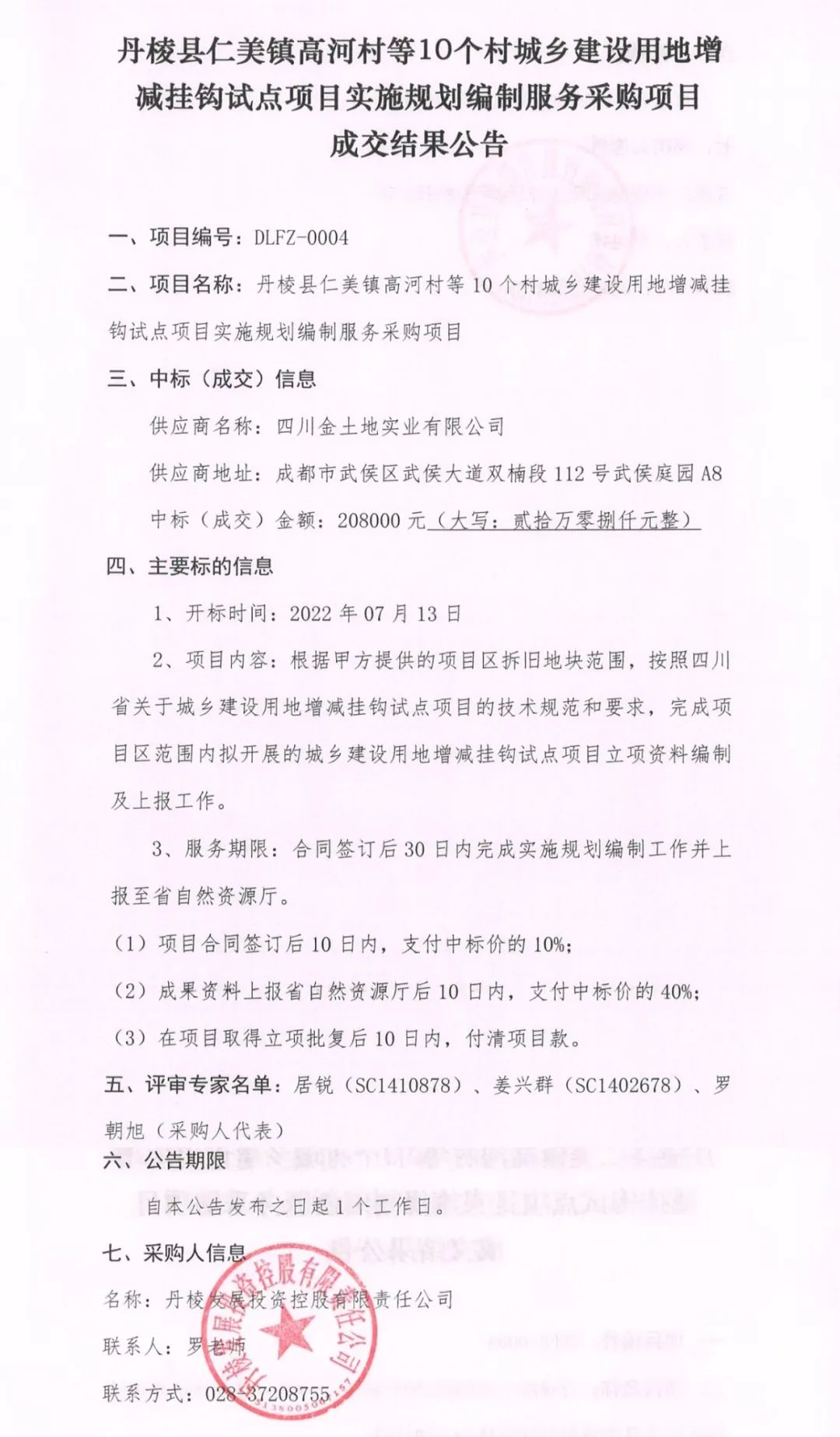 丹棱縣仁美鎮(zhèn)高河村等10個村城鄉(xiāng)建設(shè)用地增減掛鉤試點(diǎn)項(xiàng)目實(shí)施規(guī)劃編制服務(wù)采購項(xiàng)目成交結(jié)果公告