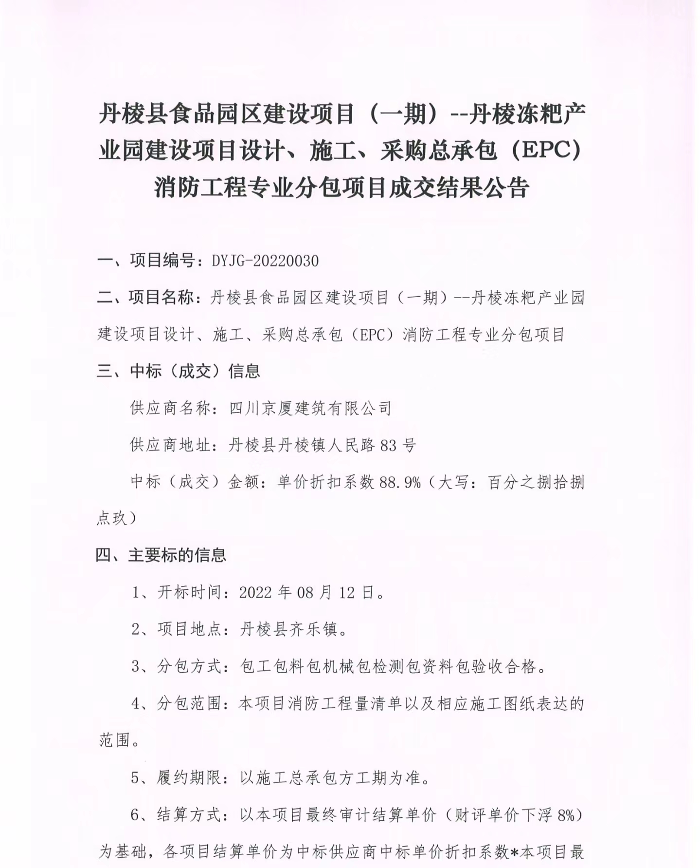 丹棱縣食品園區(qū)建設(shè)項目(一期)--丹棱凍粑產(chǎn)業(yè)園建設(shè)項目設(shè)計、施工、采購總承包(EPC)消防工程專業(yè)分包項目成交結(jié)果公告