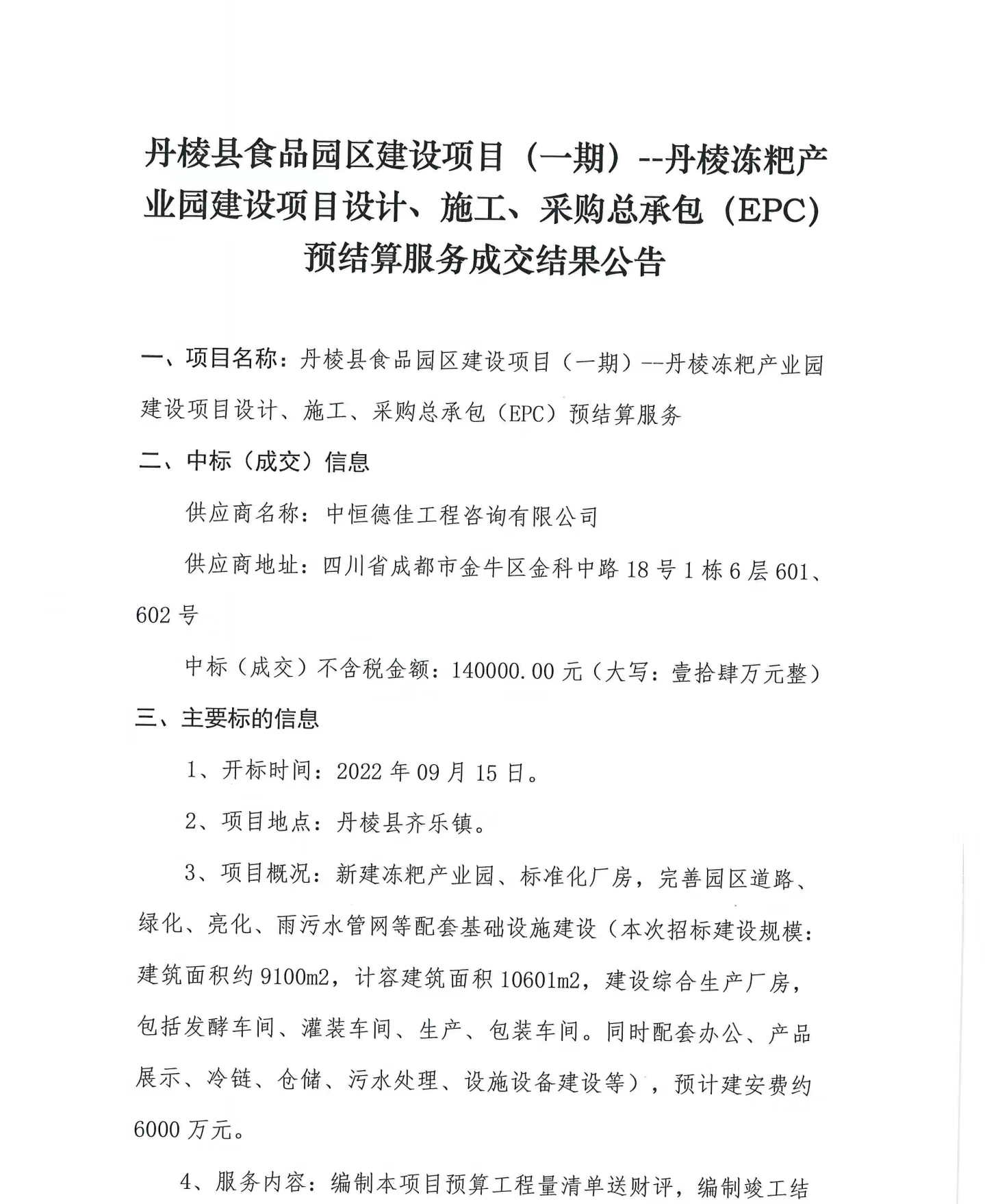 丹棱縣食品園區(qū)建設(shè)項(xiàng)目(一期)--丹棱凍粑產(chǎn)業(yè)園建設(shè)項(xiàng)目設(shè)計(jì)、施工、采購總承包(EPC)預(yù)結(jié)算服務(wù)成交結(jié)果公告