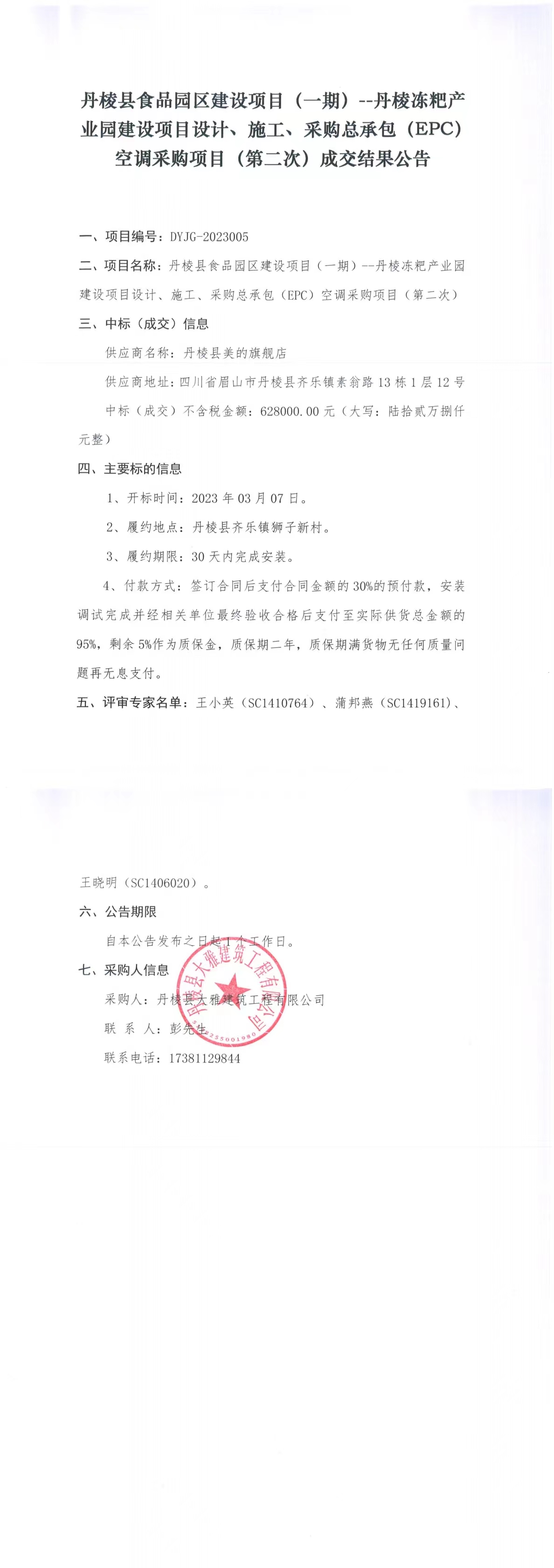 丹棱縣食品園區(qū)建設(shè)項(xiàng)目(一期)--丹棱凍粑產(chǎn)業(yè)園建設(shè)項(xiàng)目設(shè)計(jì)、施工、采購總承包(EPC)空調(diào)采購項(xiàng)目(第二次)成交結(jié)果公告