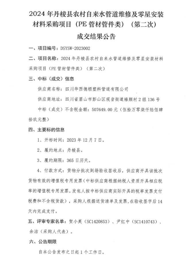 2024年丹棱縣農村自來水管道維修及零星安裝材料采購項目(PE管材管件類)(第二次)成交結果公告